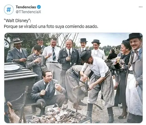 "Se viralizó una foto de Walt Disney comiendo asado", expresaron desde TendenciasX. Una imagen que es posible gracias a su visita a la Argentina en septiembre de 1941 como parte de una campaña de difusión cultural de Estados Unidos. Se estima que la fotografía es producto de una comida que se celebro el 14 del mismo mes en la estancia El Carmen, que se encuentra ubicada en el partido de Capitán Sarmiento.