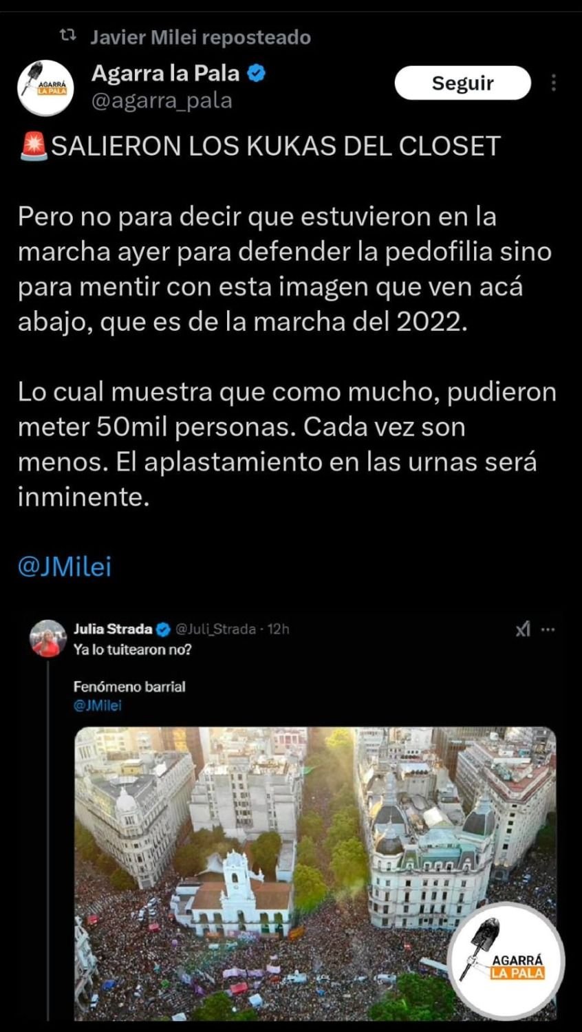 Durante este domingo y parte del sábado, Milei se encargó de compartir mensajes agresivos en sus redes sociales contra los manifestantes. “SALIERON LOS KUKAS DEL CLOSET. Pero no para decir que estuvieron en la marcha ayer para defender la pedofilia sino para mentir con esta imagen que ven acá abajo, que es de la marcha del 2022. Lo cual muestra que como mucho, pudieron meter 50mil personas. Cada vez son menos. El aplastamiento en las urnas será inminente”, reposteo.